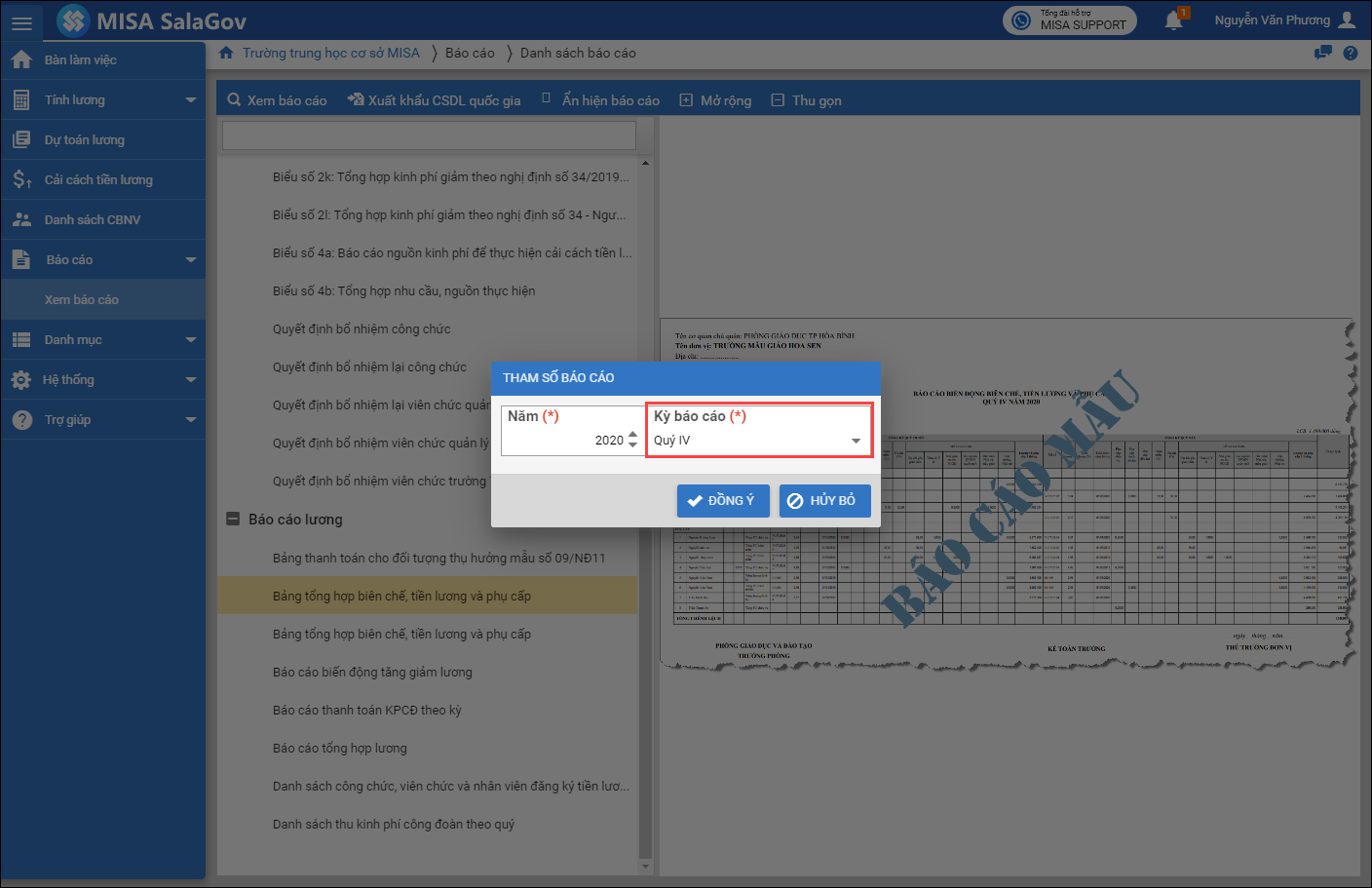 1. Tại menu Báo cáo\Xem báo cáo, chọn xem Báo cáo biến động số lượng biên chế theo quý.
