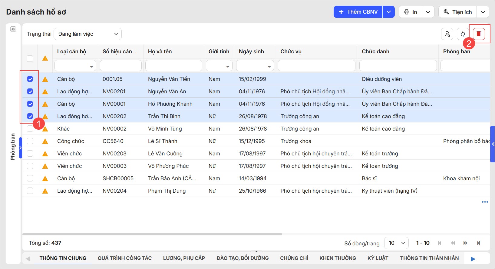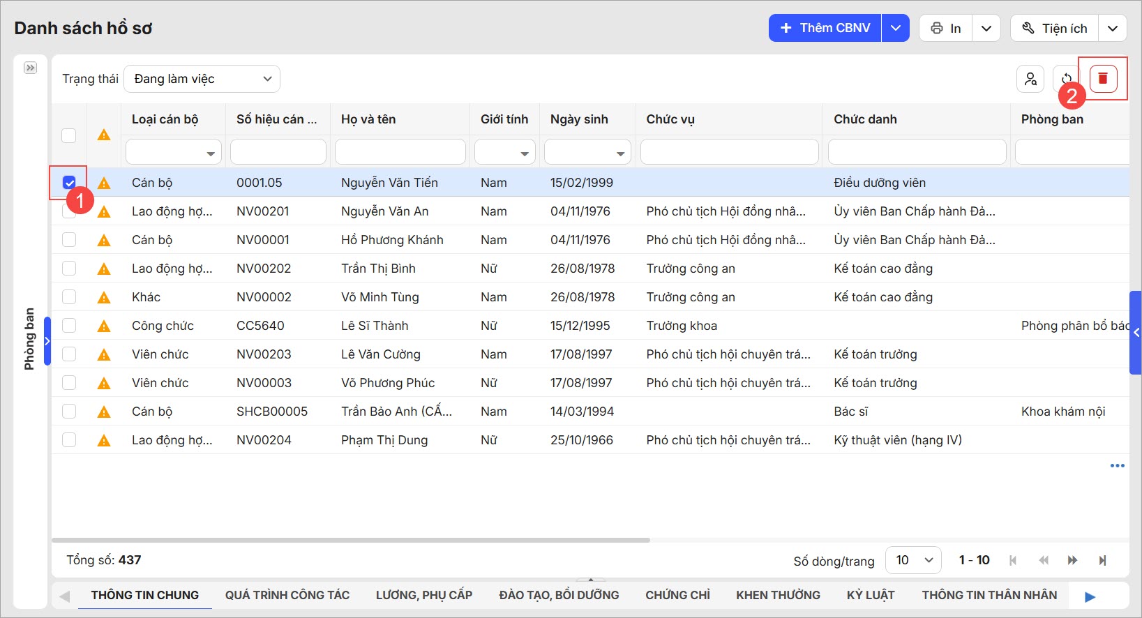 • Để xóa từng hồ sơ CBNV, tích chọn CBNV, sau đó chọn Biểu tượng thùng rác.