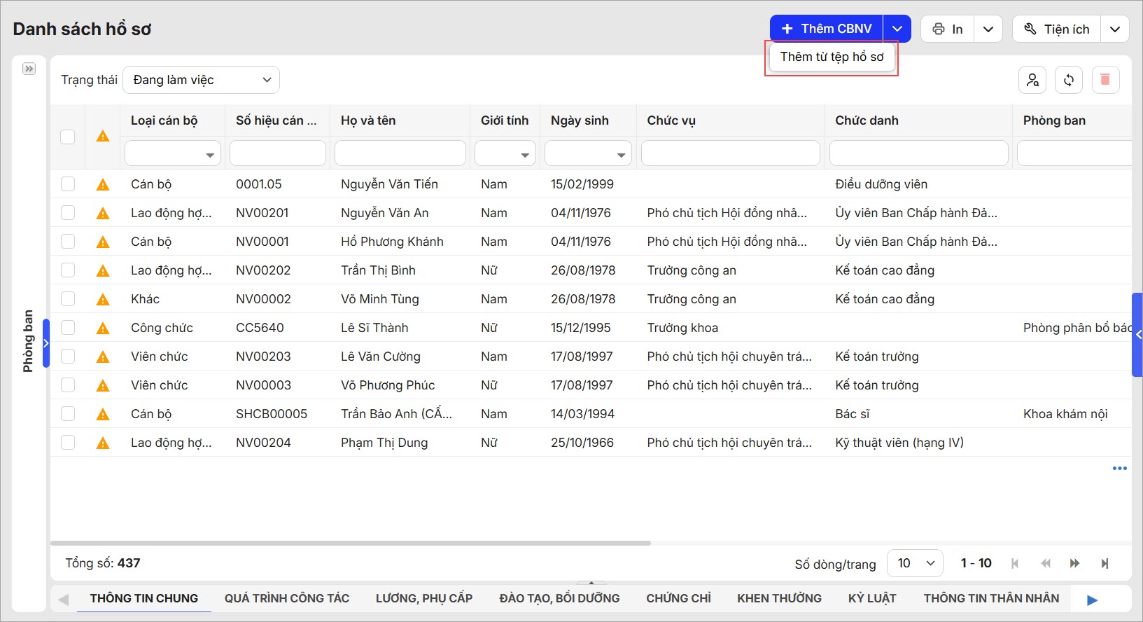 1. Vào Quản lý hồ sơ\Hồ sơ CBNV, nhấn Thêm\Thêm từ tệp hồ sơ.