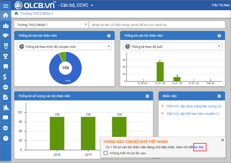 1. Đăng nhập vào phần mềm sẽ thấy thông báo tiếp nhận cán bộ, anh/chị nhấn tại đây trên thông báo để chuyển sang màn hình Tiếp nhận hồ sơ.