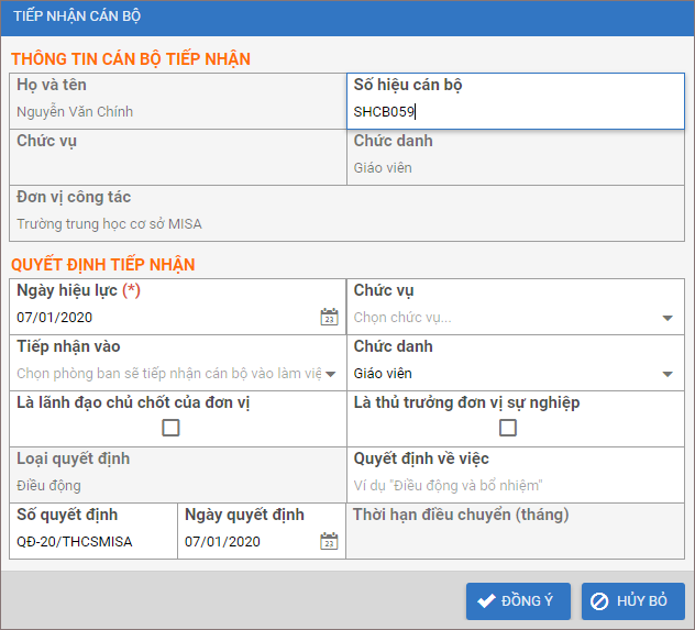 5. Nhấn Đồng ý. Hệ thống hiển thị thông báo đã tiếp nhận cán bộ nhân viên.