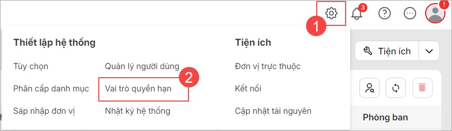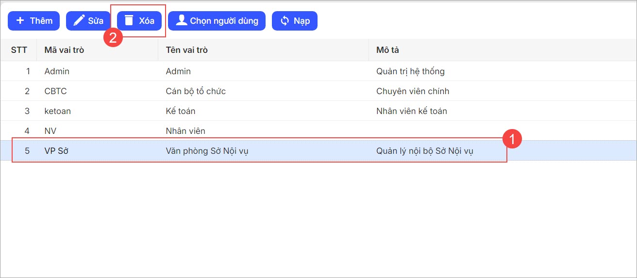 Lưu ý: Chỉ xóa được vai trò mà đơn vị tự thêm không xóa được vai trò mặc định của hệ thống. Khi xóa vai trò thì người dùng sẽ không được thực hiện chức năng của vai trò tương ứng