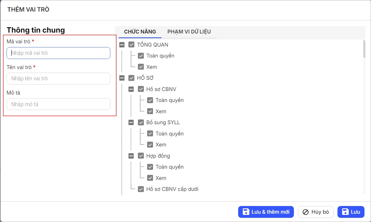 - Khai báo thông tin xác định vai trò: Nhập Mã vai trò; Tên vai trò và Mô tả vai trò.