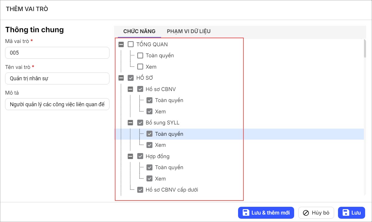 - Tích chọn quyền truy cập (Xem/Toàn quyền) của vai trò đối với những chức năng, nghiệp vụ trên MISA QLCB.