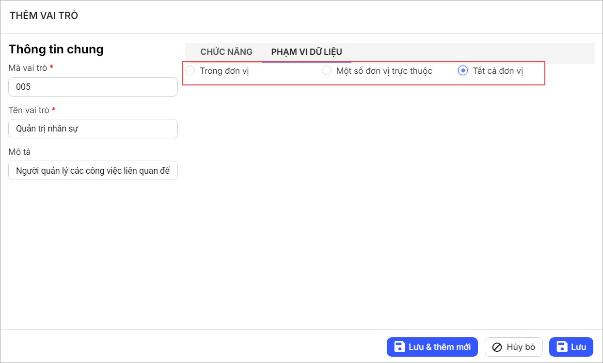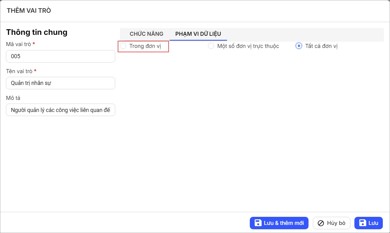 - Đối với Đơn vị trực thuộc: Chỉ có phạm vi Trong đơn vị.