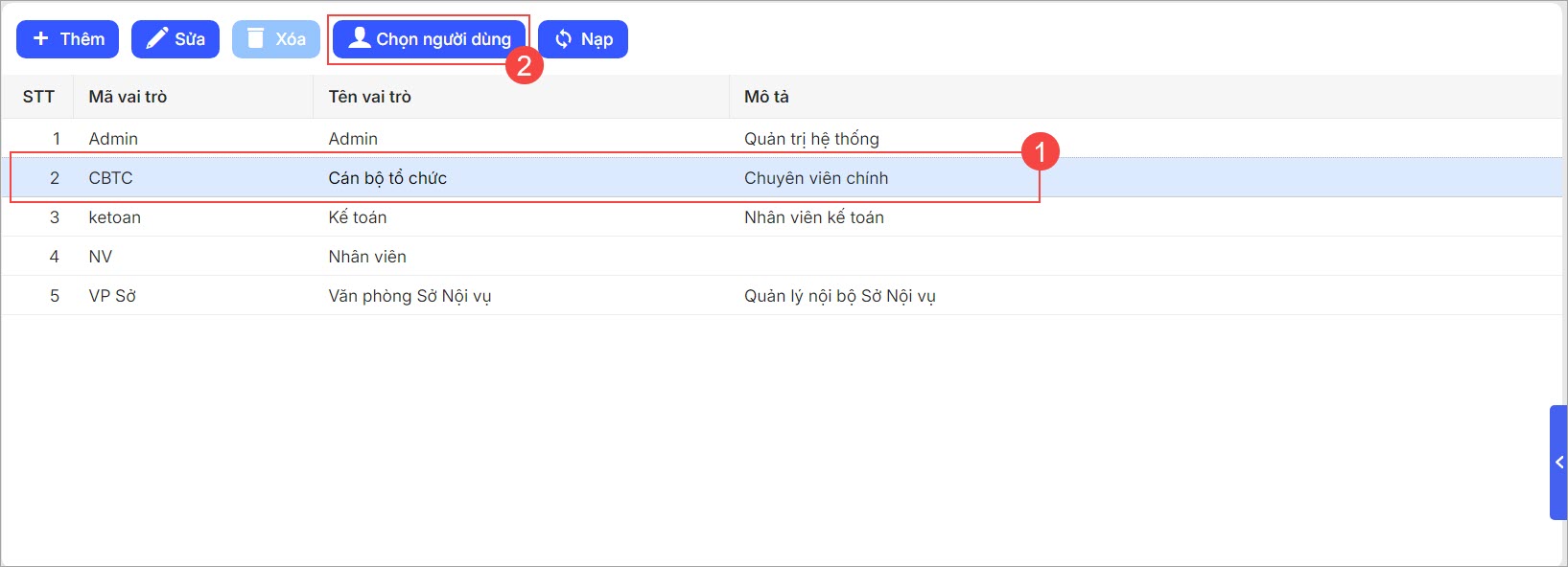 Anh/chị kiểm tra vai trò được phân quyền cho những ai trong đơn vị, sau đó tiến hành chọn người dùng cho vai trò tương ứng như sau: