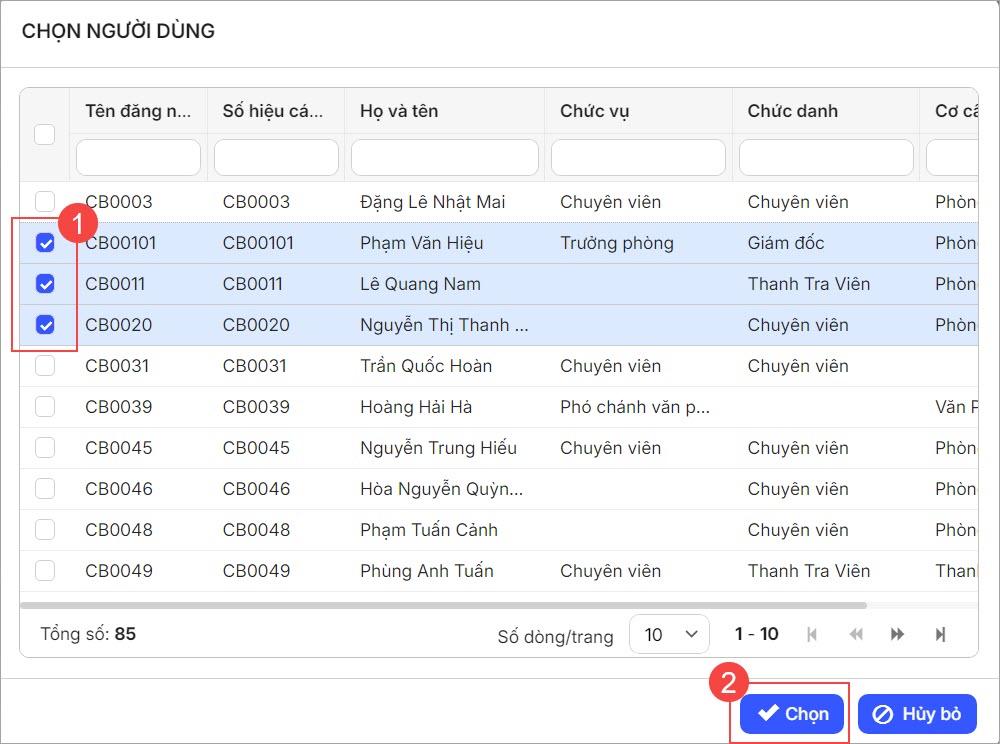 - Tích chọn các CBCCVC được dùng cho vai trò đó. Nhấn Chọn.