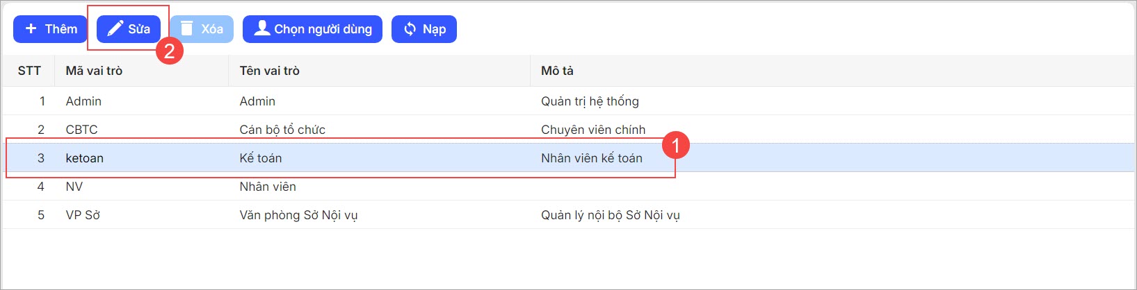 - CBTC chọn vai trò rồi nhấn Sửa và thay đổi thông tin vai trò theo thực tế đơn vị.