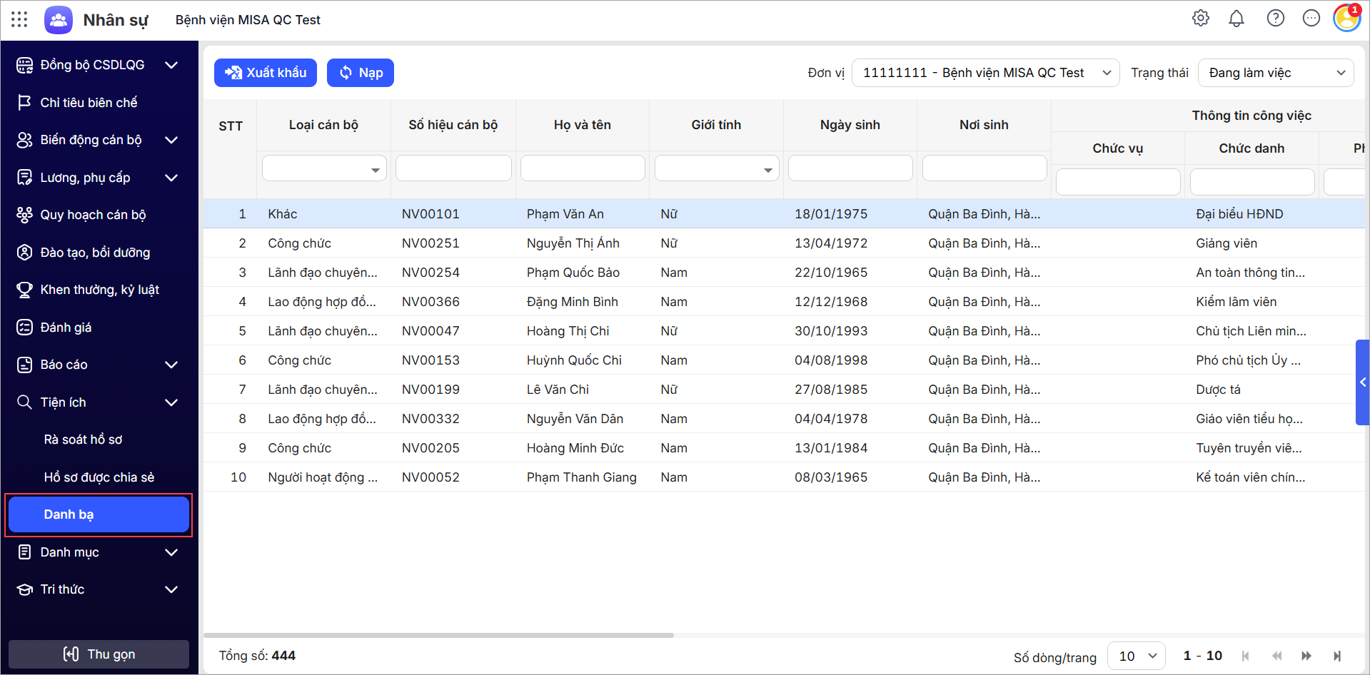 - Anh/chị có thể lọc nhanh các điều kiện tìm kiếm theo Đơn vị, Loại cán bộ, Số hiệu cán bộ, Họ và tên, Giới tính…