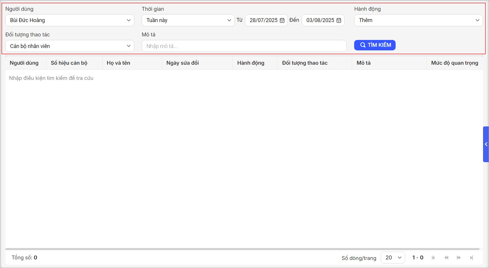 - Nhập các tiêu chí tìm kiếm, nhấn Tìm kiếm. Phần mềm đã lấy lên thông tin truy cập theo các tiêu chí vừa chọn.