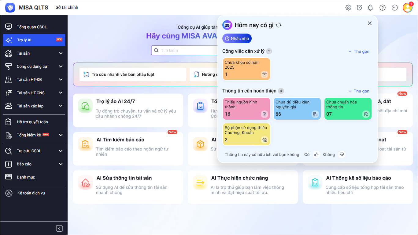 1. Khi truy cập vào phần mềm MISA QLTS, trợ lý số MISA AVA hiển thị nhắc nhở về Công việc cần xử lýThông tin cần hoàn thiện.
