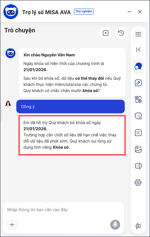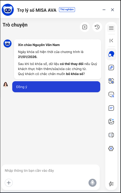 2. Trợ lý MISA AVA yêu cầu anh/chị xác nhận lại ngày bỏ khóa sổ. Anh/chị nhập Đồng ý