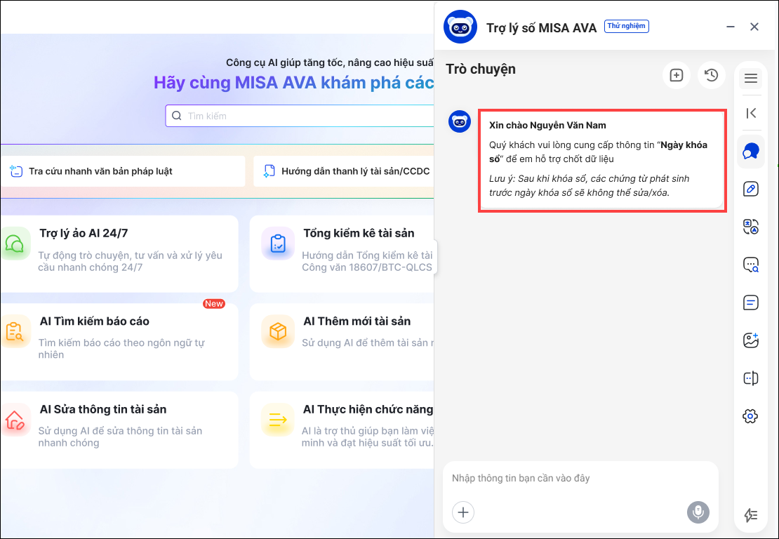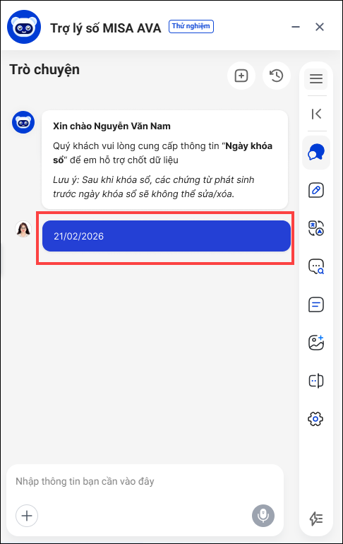 3. Trợ lý số MISA AVA yêu cầu anh/chị cung cấp ngày khóa sổ
