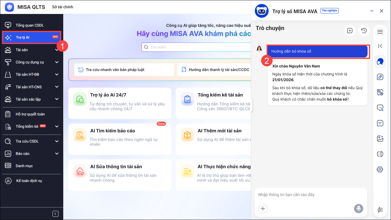AI Agent hỗ trợ cán bộ QLTS thực hiện khóa sổ, bỏ khóa sổ nhanh chóng trên phần mềm