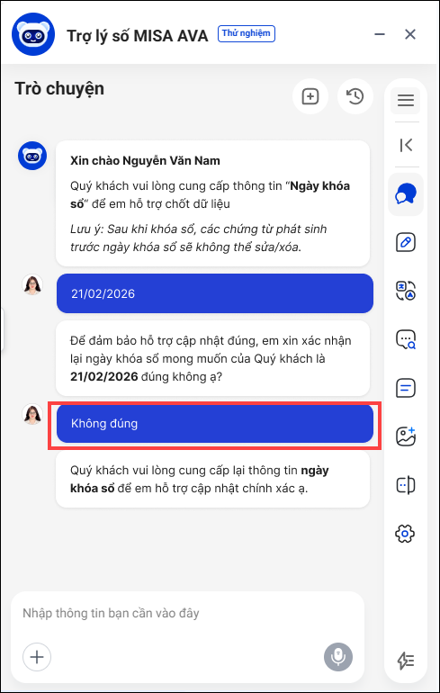 • Trường hợp muốn thay đổi ngày khóa sổ, khi MISA AVA xác nhận lại ngày khóa sổ, anh/chị nhấp Không đúng trong khung chat. Sau đó nhập lại ngày khóa sổ mới để AVA hỗ trợ