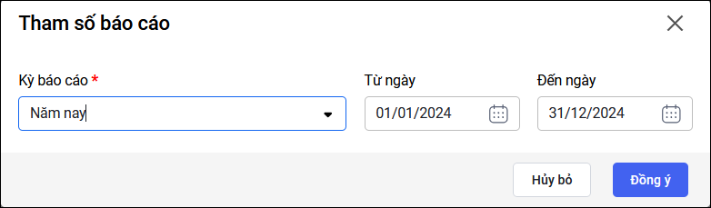 - Ô tham số Kỳ báo cáo hỗ trợ nhiều lựa chọn: chọn nhanh theo tháng, quý, năm hoặc tự xác định kỳ báo cáo bằng cách nhập “Từ ngày – Đến ngày”.