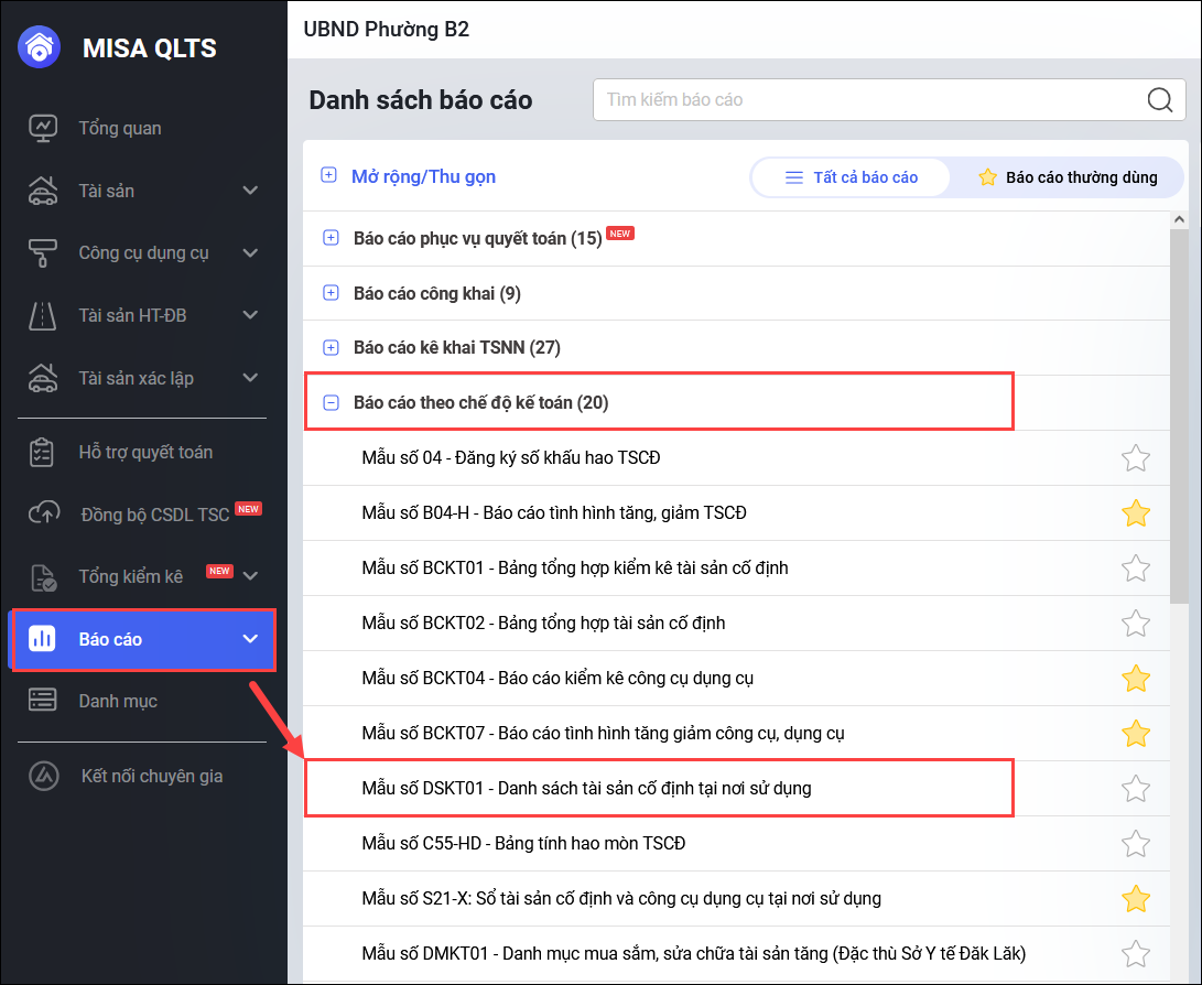 Bước 1: Vào menu Báo cáo\Báo cáo theo chế độ kế toán\ chọn Mẫu số DSKT01 – Danh sách tài sản cố định tại nơi sử dụng.