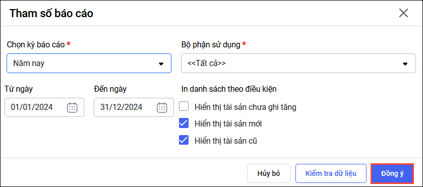 - Tích chọn Hiển thị tài sản mới để lấy những tài sản ghi tăng trong kỳ báo cáo.