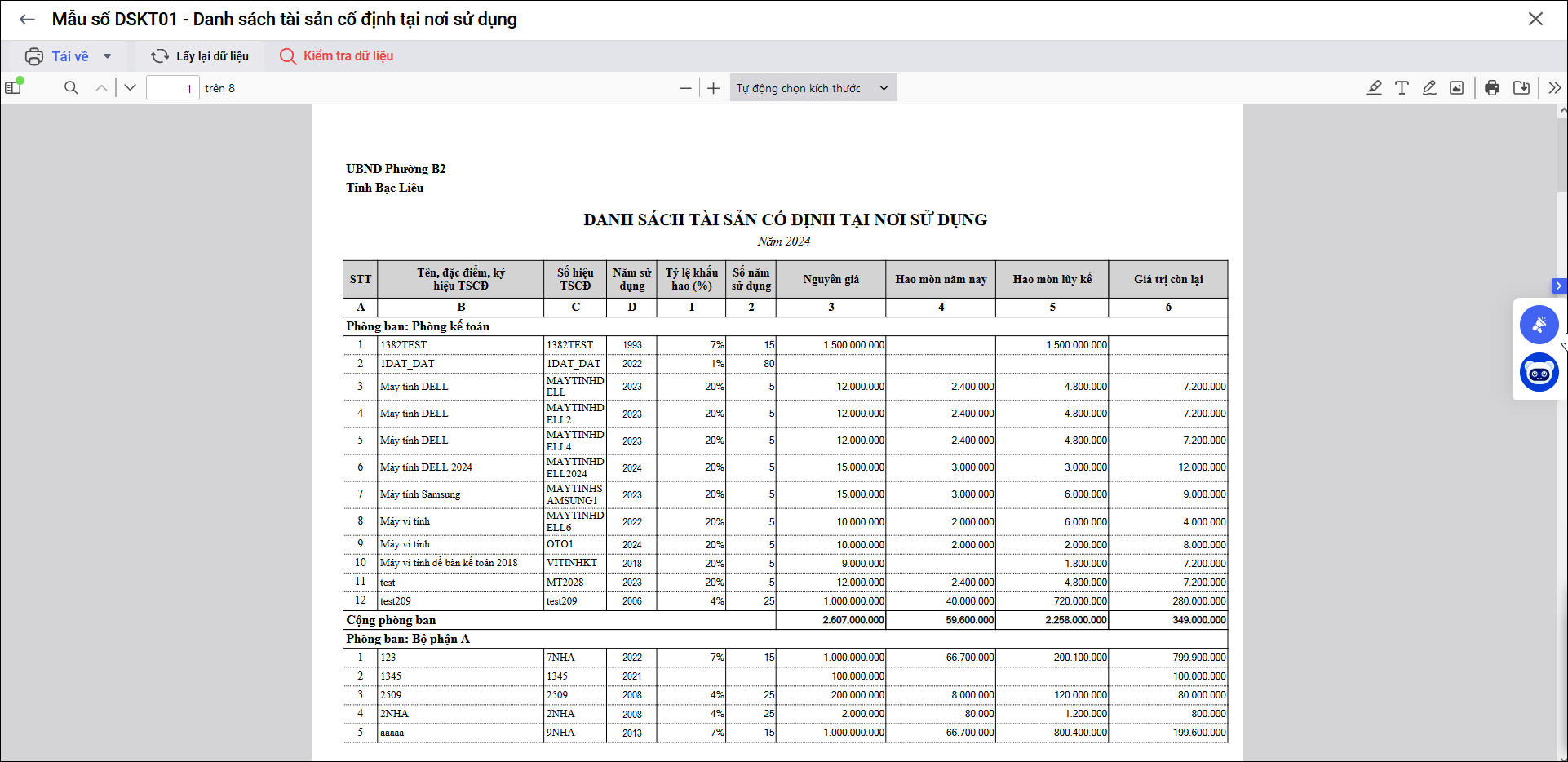 Bài viết này giúp anh/chị in được Mẫu số DSKT01 – Danh sách tài sản cố định tại nơi sử dụng. Báo cáo này giúp hỗ trợ công tác kiểm kê, quản lý hiện trạng sử dụng tài sản, đảm bảo tài sản được sử dụng đúng mục đích và nâng cao hiệu quả quản lý tài sản công.