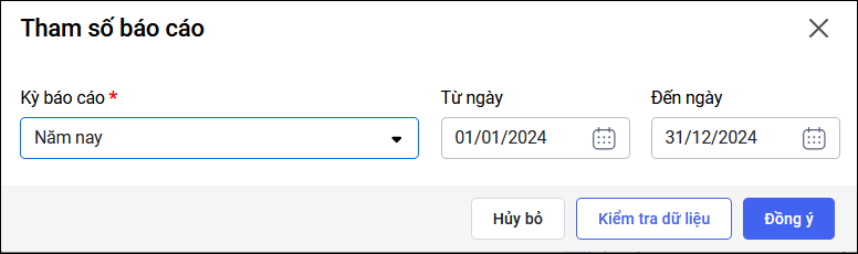 - Ô tham số Kỳ báo cáo hỗ trợ nhiều lựa chọn: chọn nhanh theo tháng, quý, năm hoặc tự xác định kỳ báo cáo bằng cách nhập “Từ ngày” – “Đến ngày”.