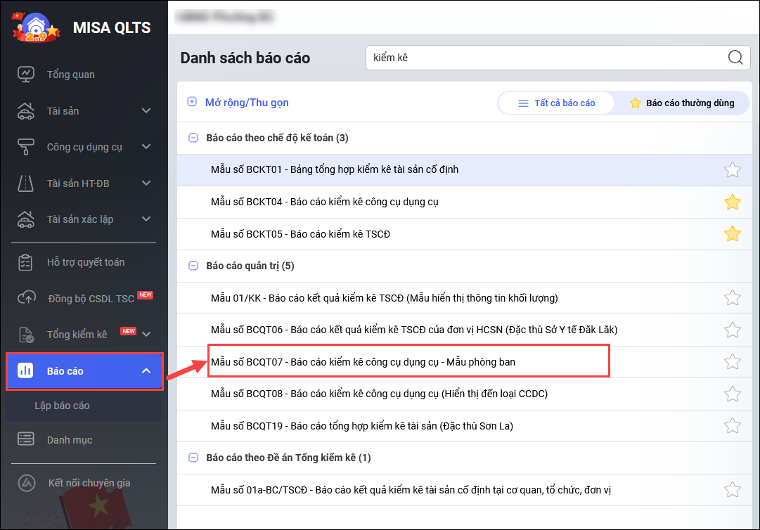 Bước 1: Vào menu Báo cáo\Báo cáo quản trị\chọn Mẫu số BCQT07 – Báo cáo kiểm kê công cụ dụng cụ – Mẫu phòng ban.