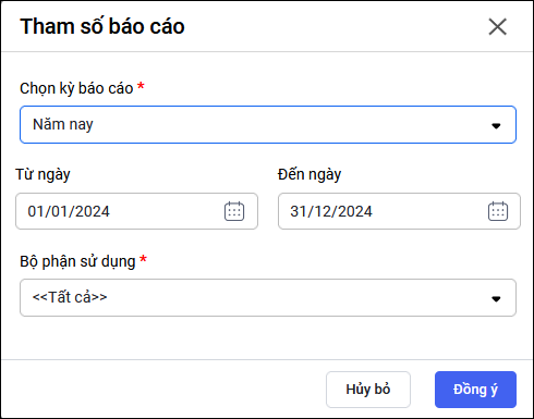 - Bộ phận sử dụng: Chọn bộ phận sử dụng cần xem hoặc chọn “Tất cả” để in tất cả bộ phận.