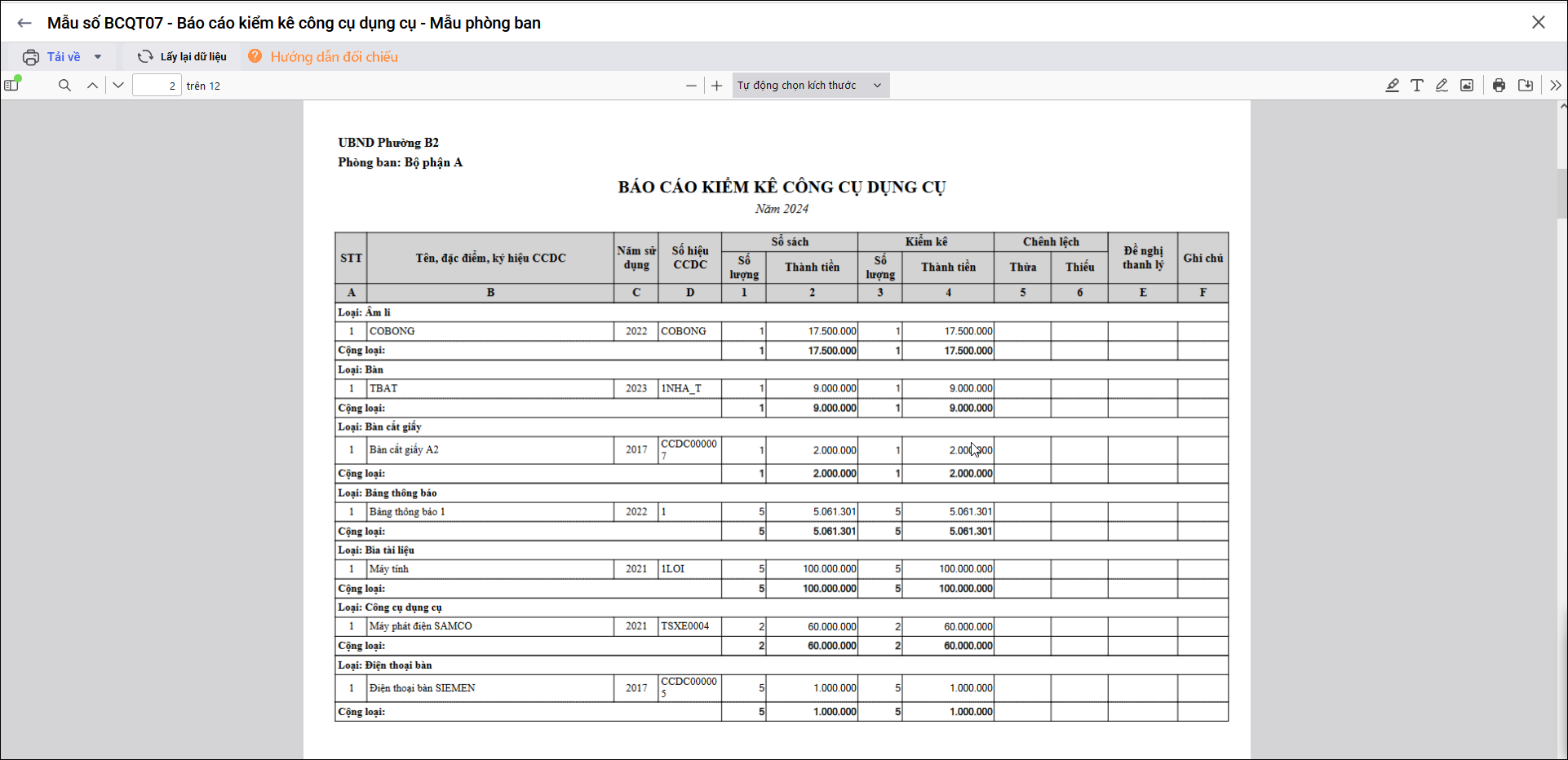 - Lấy danh sách công cụ dụng cụ nằm trong chứng từ kiểm kê công cụ dụng cụ có ngày kiểm kê trong kỳ báo cáo, tổng hợp theo từng phòng ban (bộ phận sử dụng).