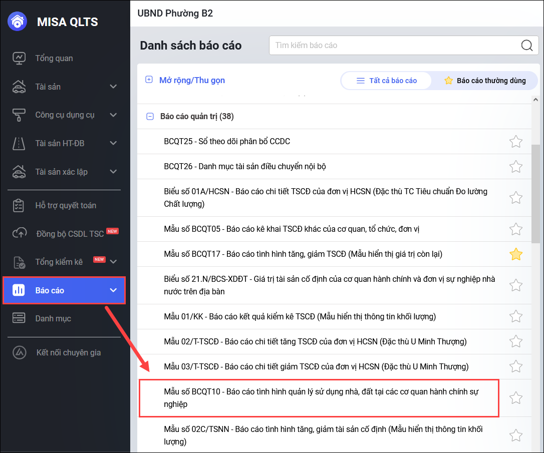 Bước 1: Vào menu Báo cáo\Báo cáo quản trị\ chọn Mẫu số BCQT10 – Báo cáo tình hình quản lý sử dụng nhà, đất tại các cơ quan hành chính sự nghiệp.