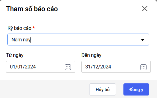 - Ô tham số Kỳ báo cáo hỗ trợ nhiều lựa chọn: chọn nhanh theo tháng, quý, năm hoặc tự xác định kỳ báo cáo bằng cách nhập “Từ ngày – Đến ngày”.