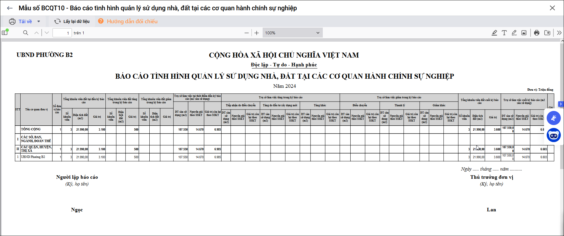 Bài viết này giúp anh/chị nắm được cập nhật cho phép in Mẫu số BCQT10 – Báo cáo tình hình quản lý sử dụng nhà, đất tại các cơ quan hành chính sự nghiệp trên phần mềm IHOS Tài sản, phục vụ công tác quản lý và báo cáo tài sản theo quy định.