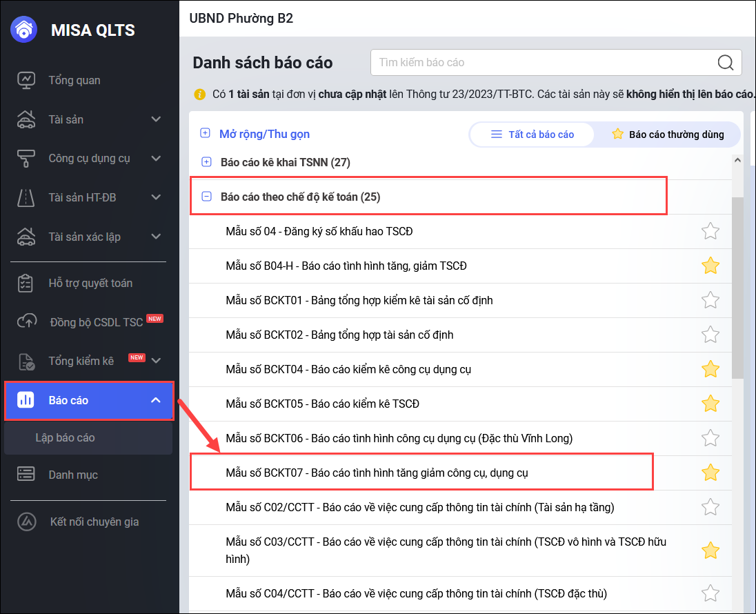 Bước 1: Vào menu Báo cáo\Báo cáo theo chế độ kế toán\chọn Mẫu số BCKT07 – Báo cáo tình hình tăng giảm công cụ
