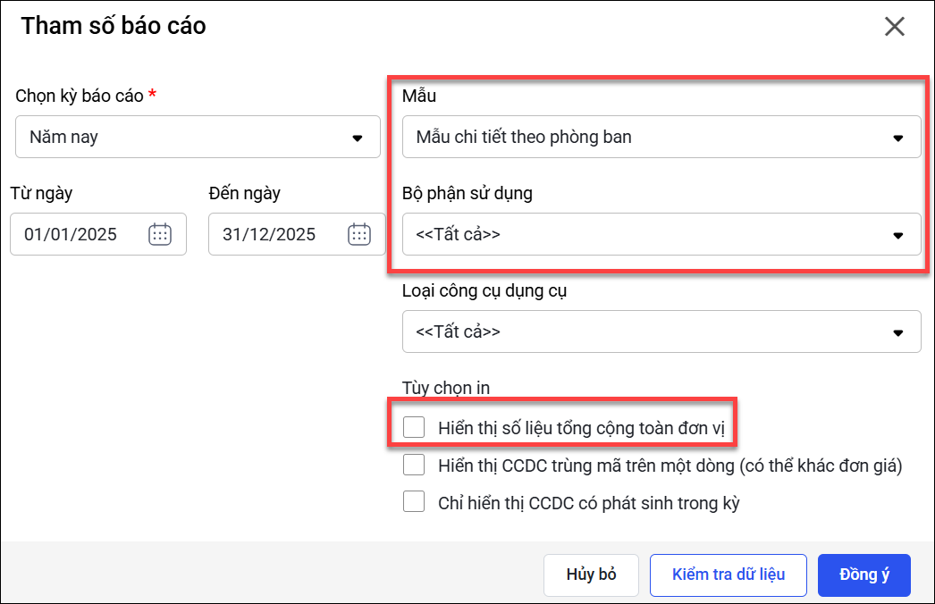 Không tích chọn “Hiển thị số liệu tổng cộng toàn đơn vị”: Số liệu CCDC được hiển thị riêng theo từng phòng ban, mỗi phòng ban tương ứng một trang báo cáo.