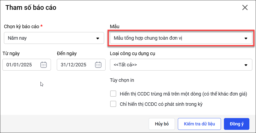 - Mẫu Tổng hợp chung toàn đơn vị: Thể hiện số CCDC của toàn đơn vị, không phân biệt phòng ban.