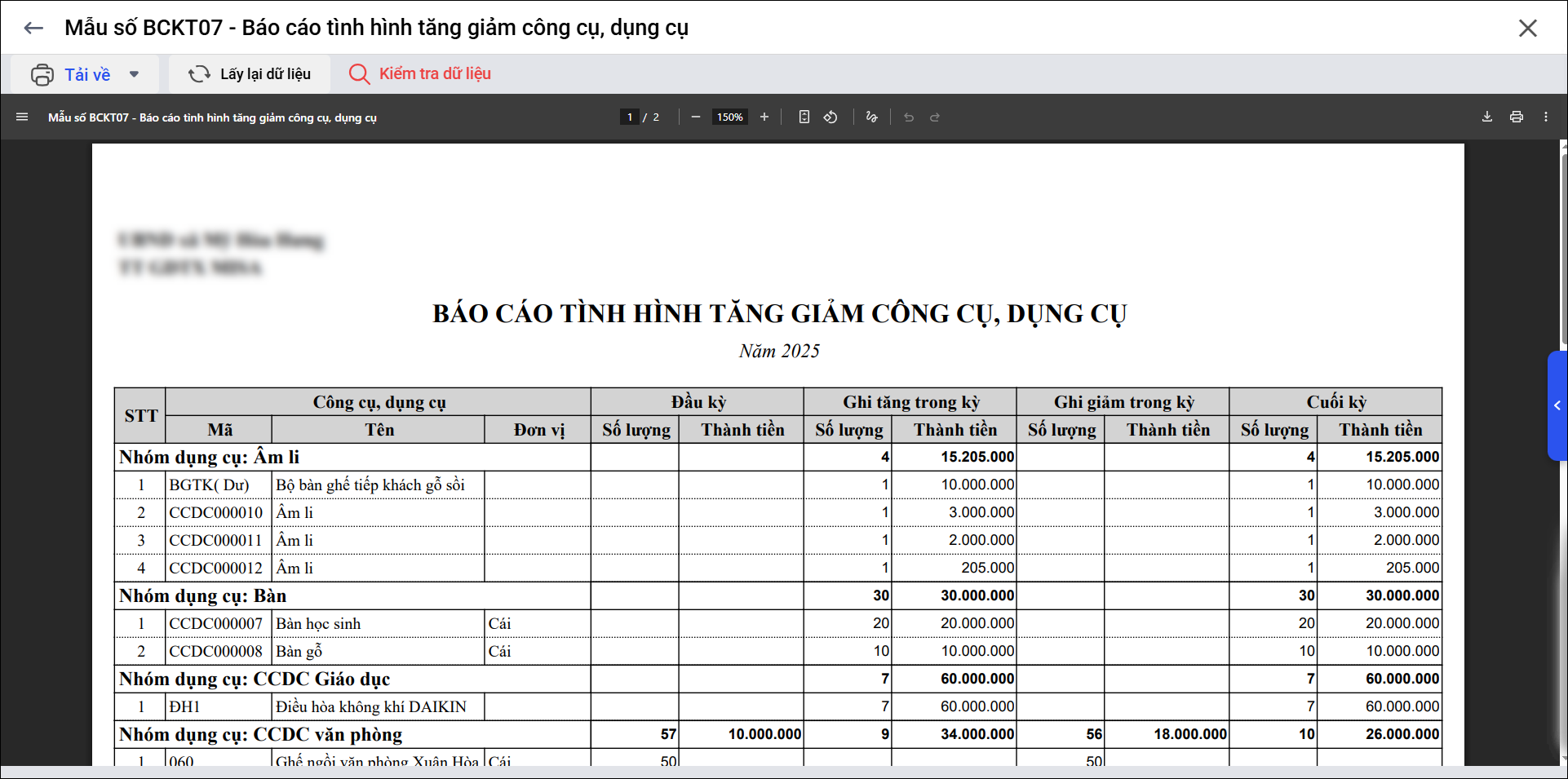 Bài viết này giúp anh/chị in được Mẫu số BCKT07 – Báo cáo tình hình tăng giảm công cụ, dụng cụ nhằm theo dõi biến động công cụ, dụng cụ gồm: số lượng, giá trị đầu kỳ, phát sinh tăng, phát sinh giảm và số cuối kỳ.
