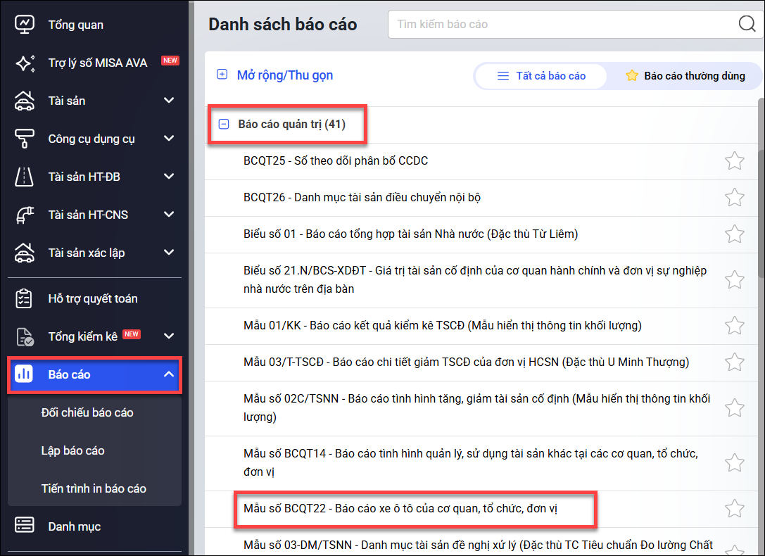 Bước 1: Vào menu Báo cáo\Báo cáo quản trị\ chọn Mẫu số BCQT22 – Báo cáo xe ô tô của cơ quan, tổ chức, đơn vị.