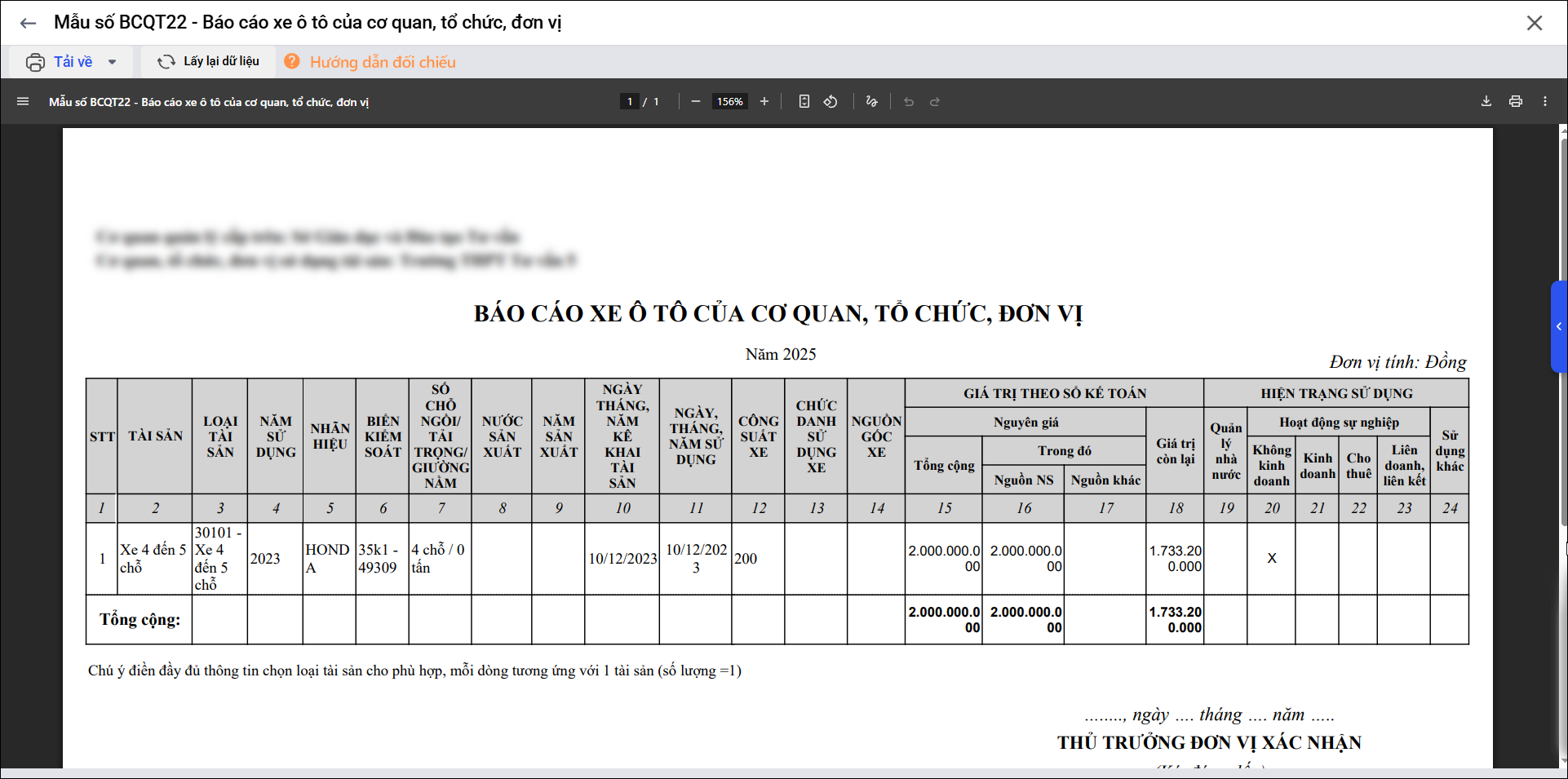 4. Mẫu số BCQT22 – Báo cáo xe ô tô của cơ quan, tổ chức, đơn vị