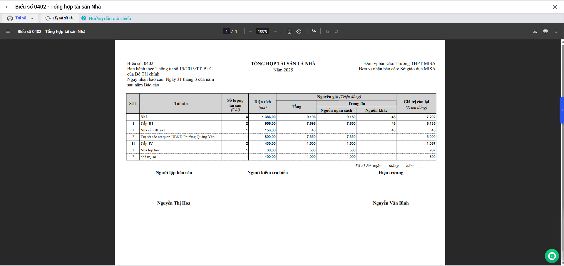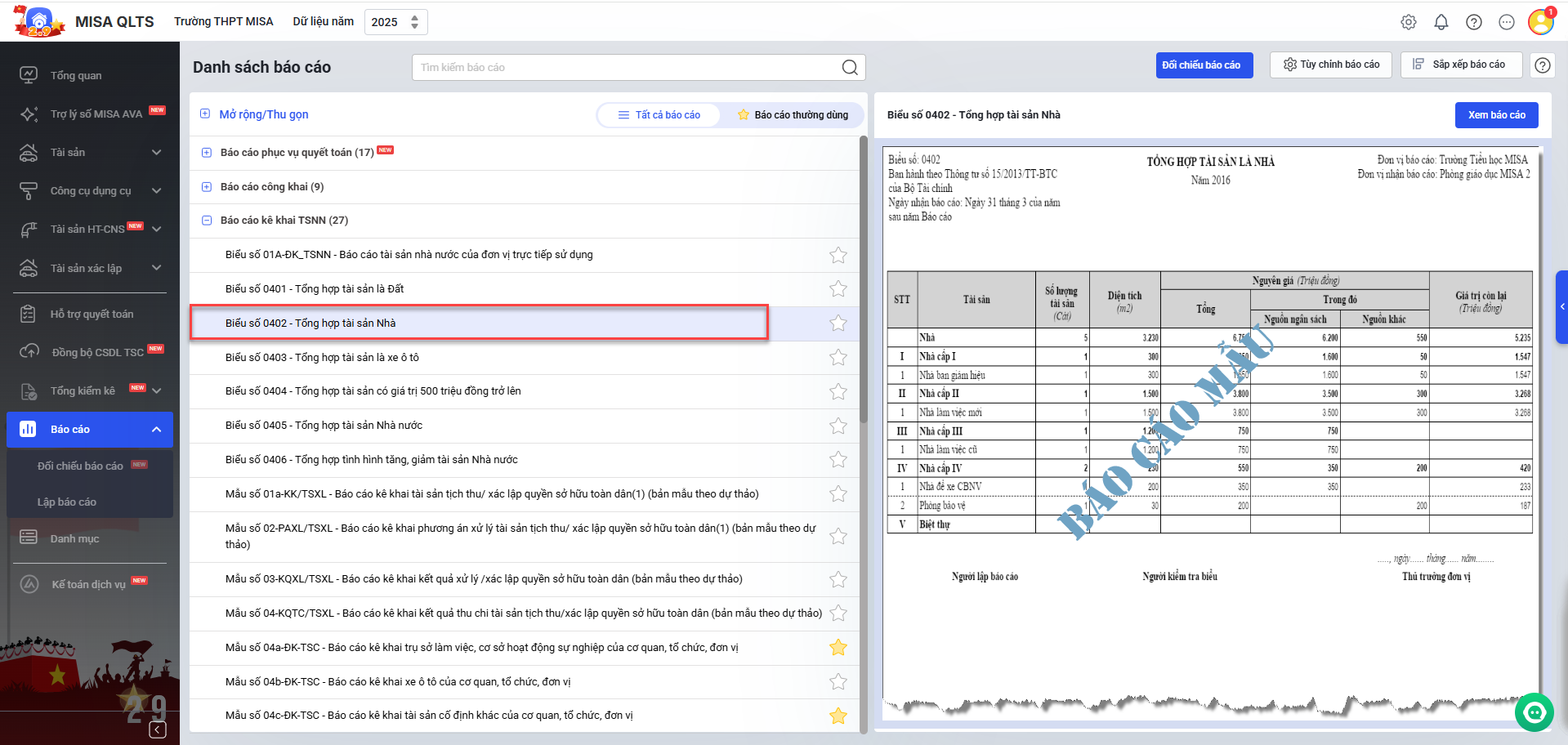 Bài viết giới thiệu tính năng mới giúp anh/chị in được Biểu số 0402 – Tổng hợp tài sản Nhà.