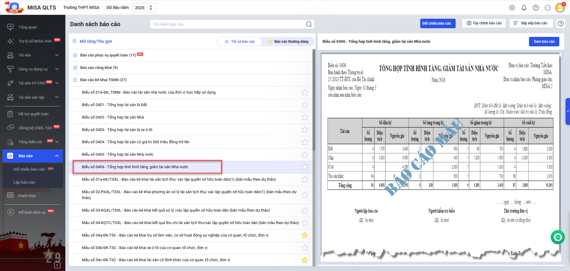 Bài viết giới thiệu tính năng mới giúp đơn vị in được Biểu số 0406 – Tổng hợp tình hình tăng, giảm tài sản Nhà nước.