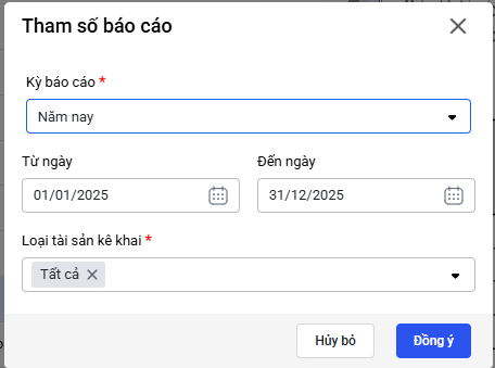 • Số đầu kỳ lấy danh sách tài sản có trạng thái đang sử dụng vào đầu kỳ báo cáo.