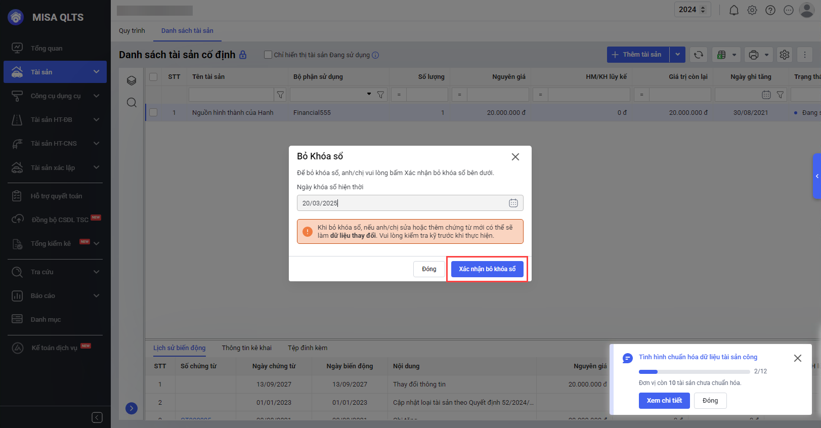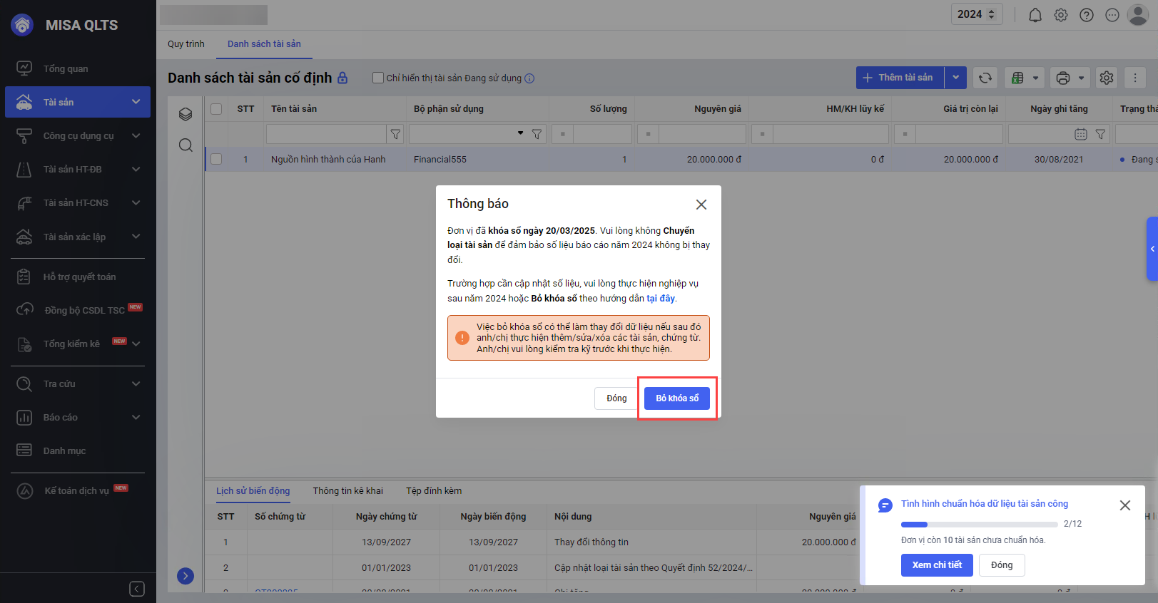 - Nếu muốn chỉnh sửa thông tin tài sản, chọn Bỏ khóa sổ. Lưu ý: Sau khi bỏ khóa sổ, nếu thực hiện thêm, sửa, xóa tài sản sẽ ảnh hưởng đến chứng từ và báo cáo.