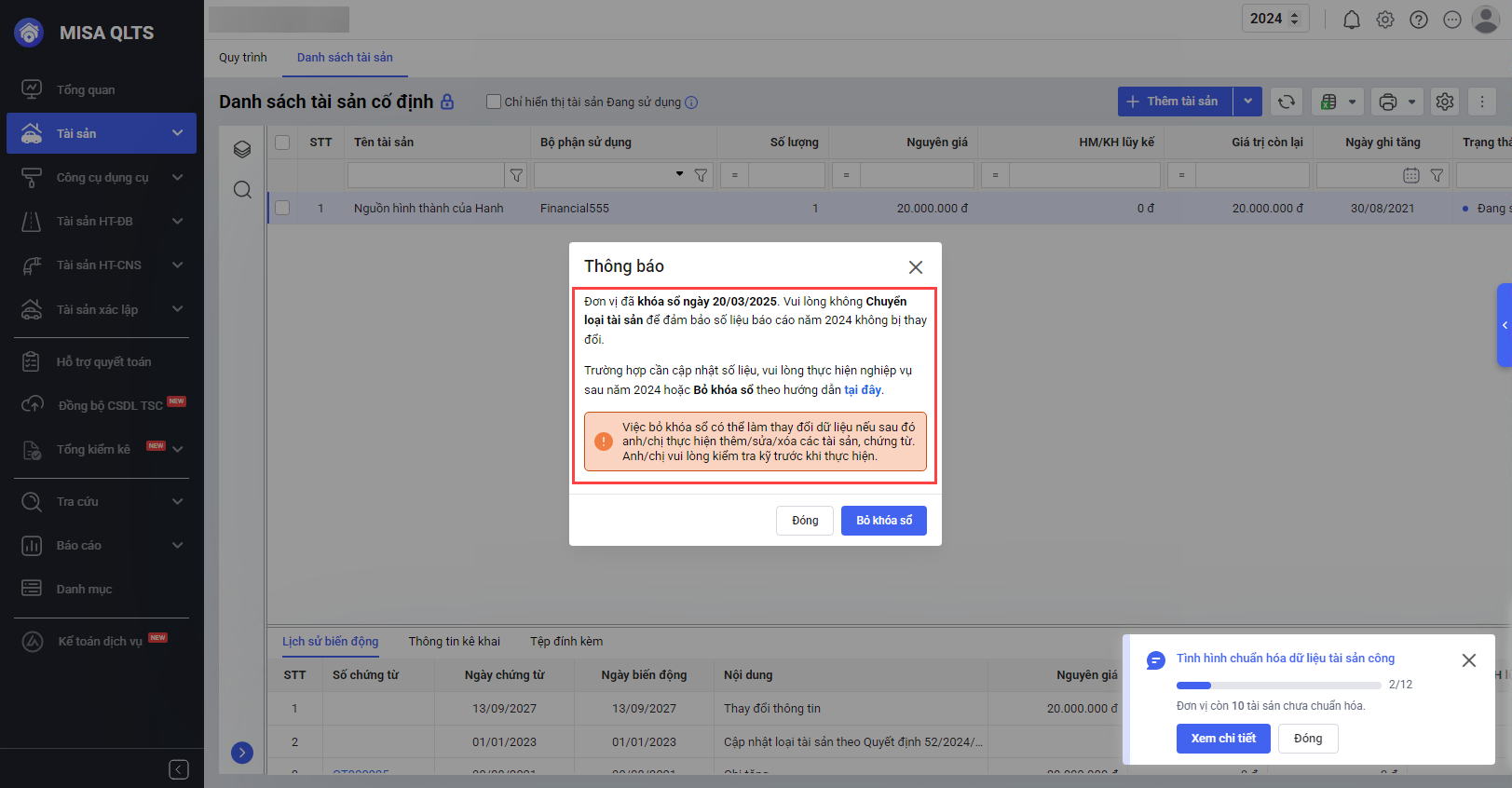 Sau khi khóa sổ hoàn thành, nếu cần sửa thông tin tài sản sau ngày khóa sổ, phần mềm sẽ hiển thị thông báo.