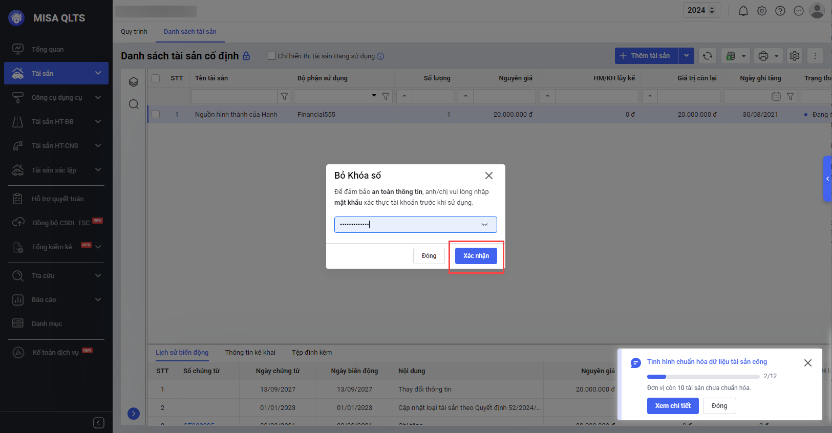 - Nhập mật khẩu đăng nhập vào phần mềm iHos Tài sản/QLTS, chọn Xác nhận.