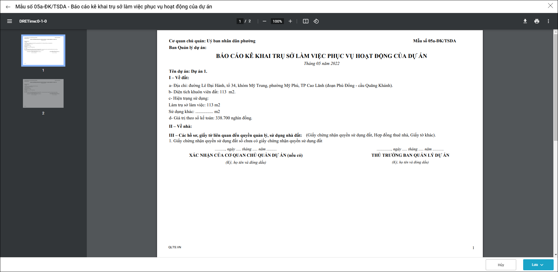 Báo cáo kê khai trụ sở làm việc phục vụ hoạt động của dự án, bao gồm thông tin về đất và nhà sử dụng cho dự án. Báo cáo phản ánh địa chỉ, diện tích khuôn viên, hiện trạng sử dụng và giá trị theo sổ kế toán. Báo cáo kèm theo các hồ sơ, giấy tờ pháp lý liên quan đến quyền quản lý, sử dụng tài sản. Số liệu là căn cứ phục vụ công tác quản lý và báo cáo tài sản dự án theo quy định.