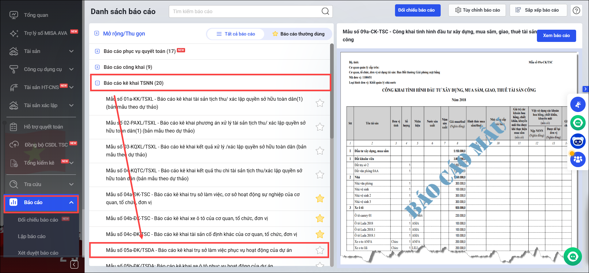 Bước 1: Vào menu Báo cáo\Báo cáo kê khai TSNN\chọn Mẫu số 05a-ĐK/TSDA: Báo cáo kê khai trụ sở làm việc phục vụ hoạt động của dự án.