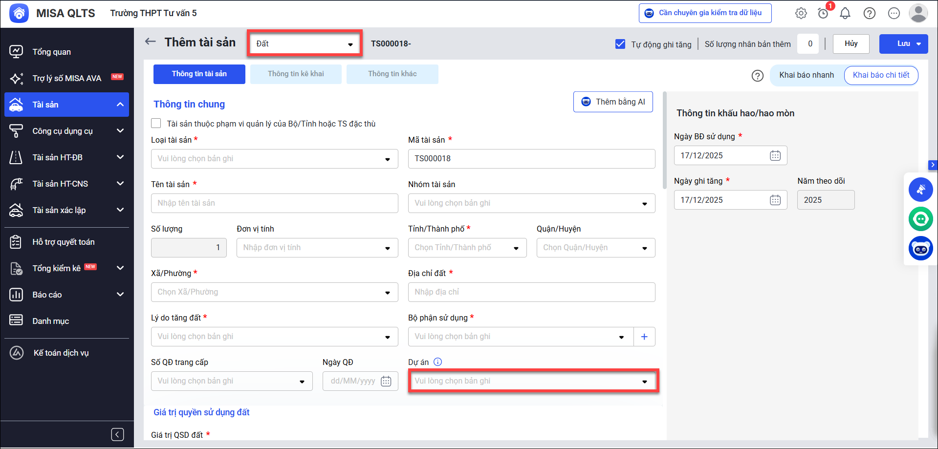 Để lên được báo cáo khi khai báo tài sản, chọn loại tài sản là đất, nhà đồng thời bắt buộc khai báo thông tin dự án.