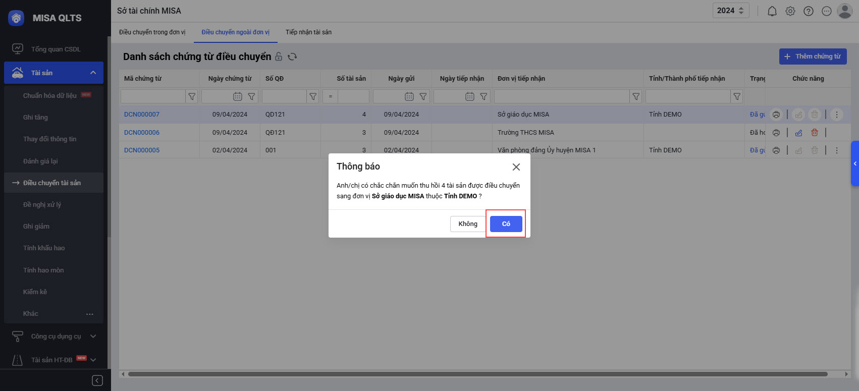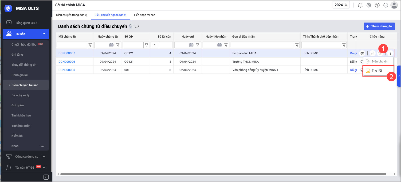 Bổ sung chức năng thu hồi điều chuyển tài sản ngoài đơn vị
