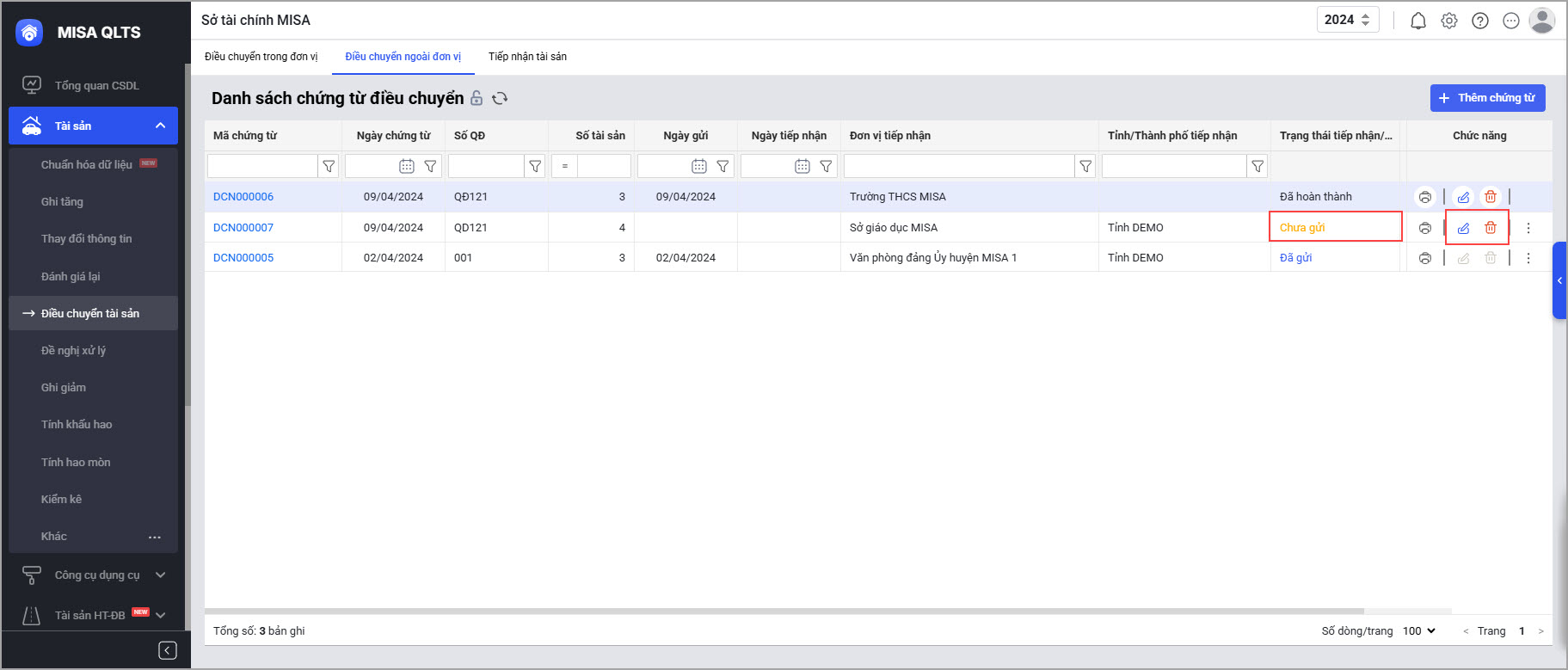 Lưu ý: Chức năng này áp dụng cho trường hợp muốn thu hồi chứng từ điều chuyển tài sản khi phát hiện điều chuyển nhầm tài sản, sai thông tin chứng từ, hoặc thay đổi quyết định điều chuyển và đơn vị tiếp nhận chưa tiếp nhận tài sản.