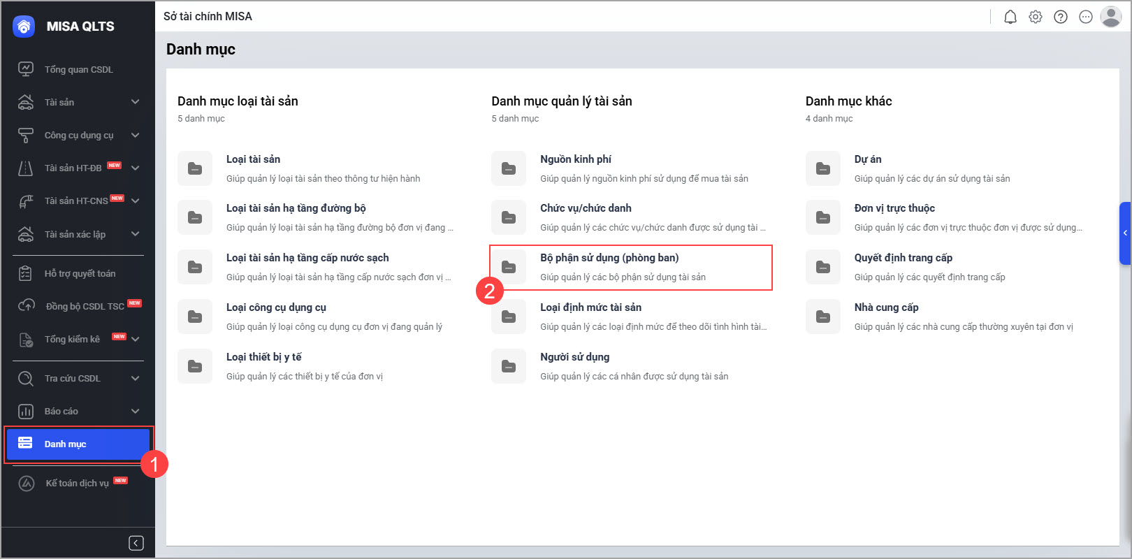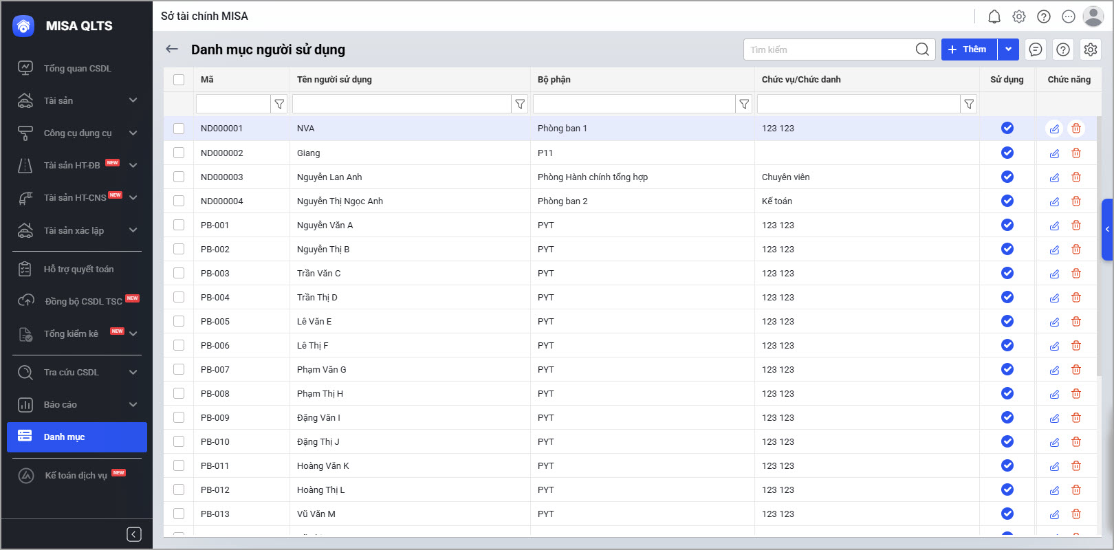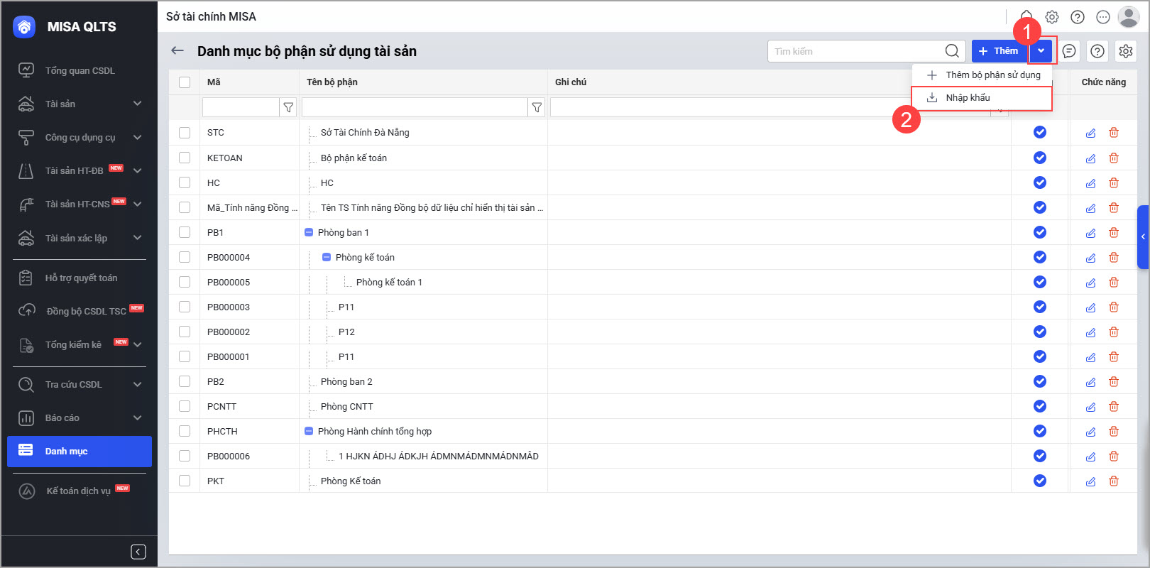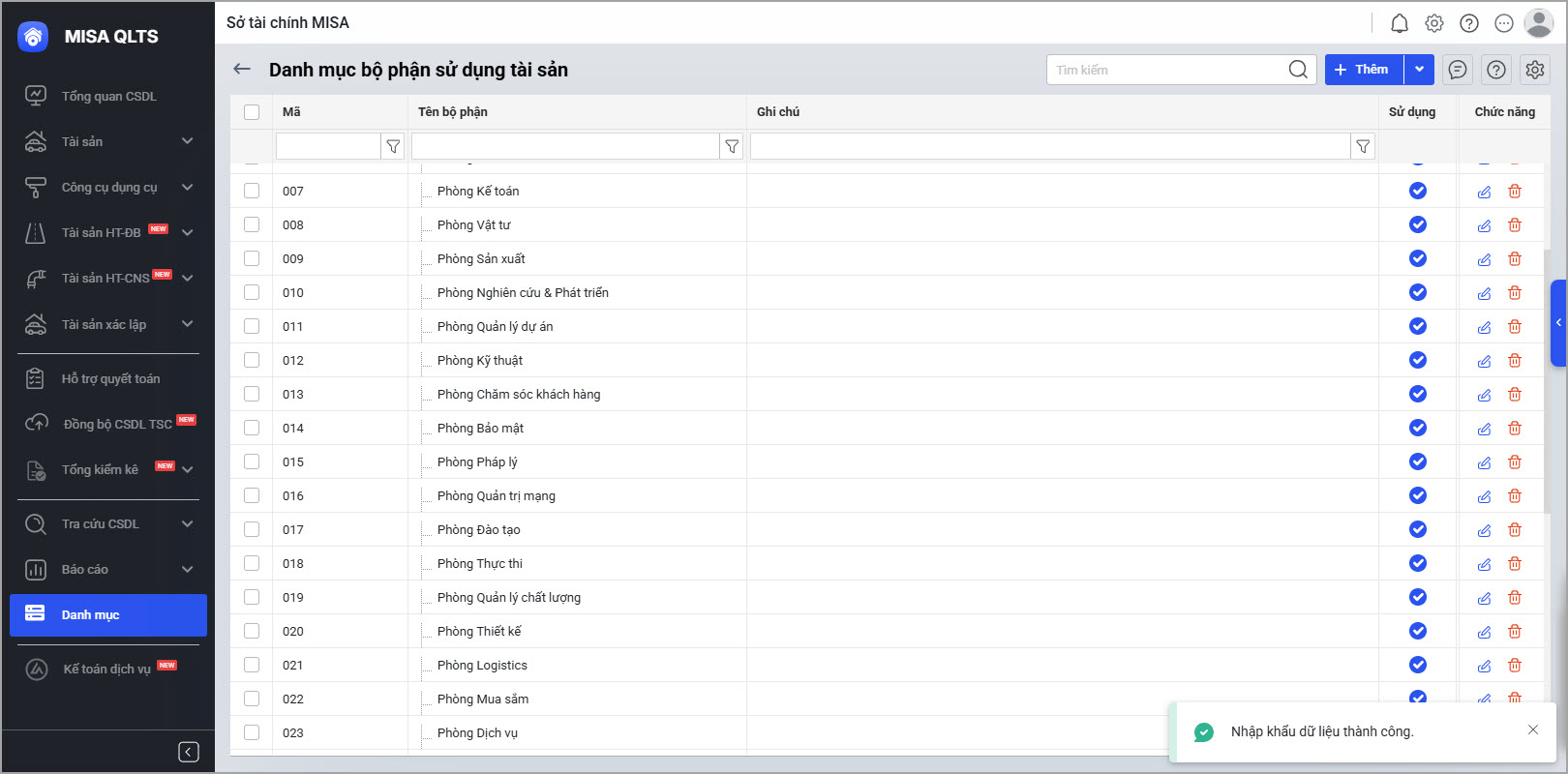 • Phần mềm sẽ hiển thị danh mục Bộ phận sử dụng tài sản theo danh sách vừa được nhập khẩu