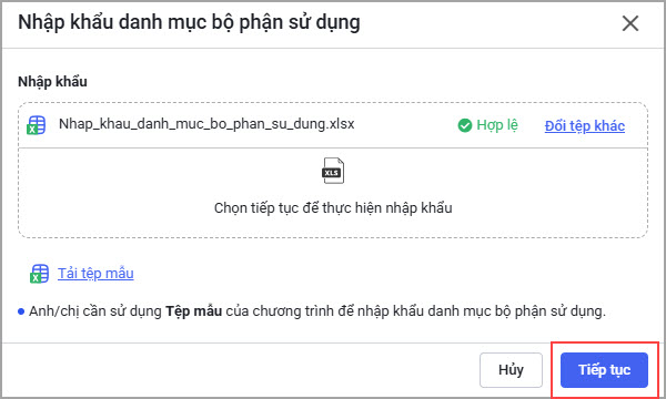 • Sau khi hoàn thành khai báo bộ phận sử dụng trong file nhập khẩu, anh/chị tải file này vào phần mềm bằng cách kéo thả hoặc chọn tệp từ thiết bị để thực hiện quá trình nhập khẩu bộ phận sử dụng