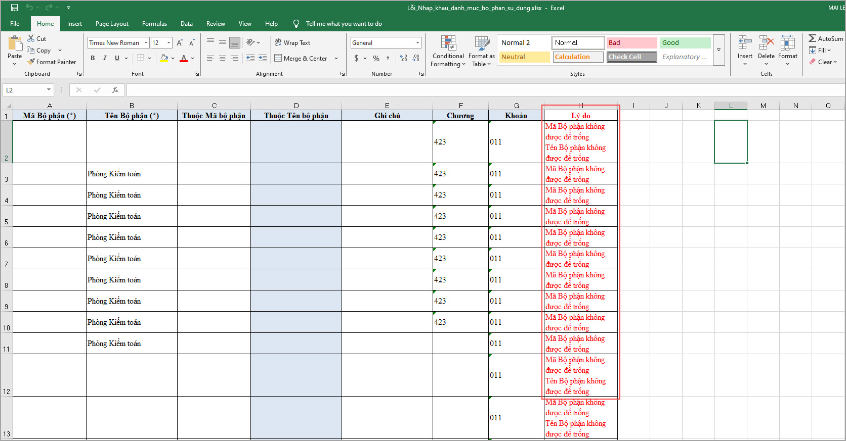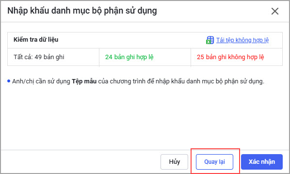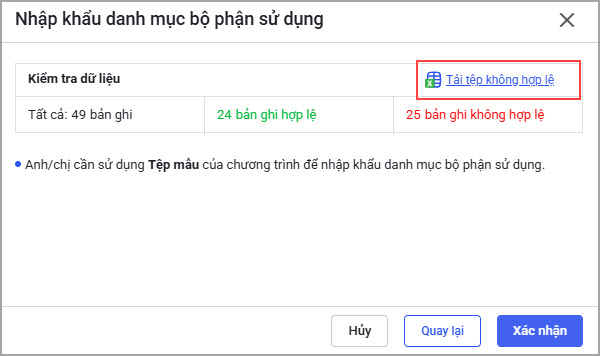 • Phần mềm sẽ hiển thị nguyên nhân lỗi để người dùng biết. Anh/chị cần sửa thông tin sai vào file mẫu và lưu lại file sau khi chỉnh sửa để tiếp tục quá trình nhập khẩu.